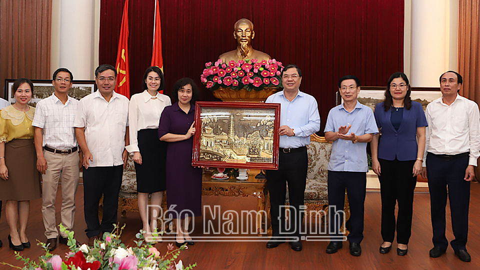 | Các đồng chí lãnh đạo tỉnh tặng Đoàn công tác Tổng Cục Thống kê bức tranh Tháp Phổ Minh - biểu tượng của tỉnh Nam Định.