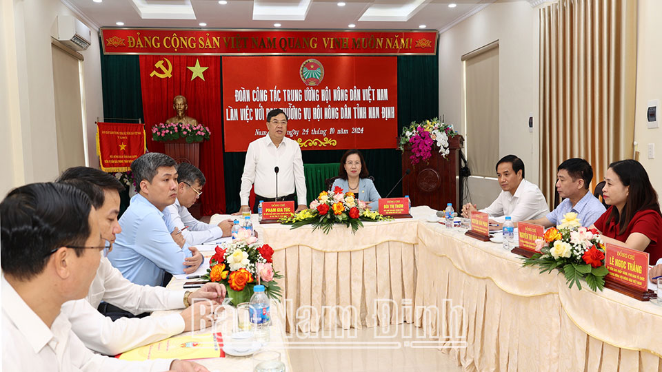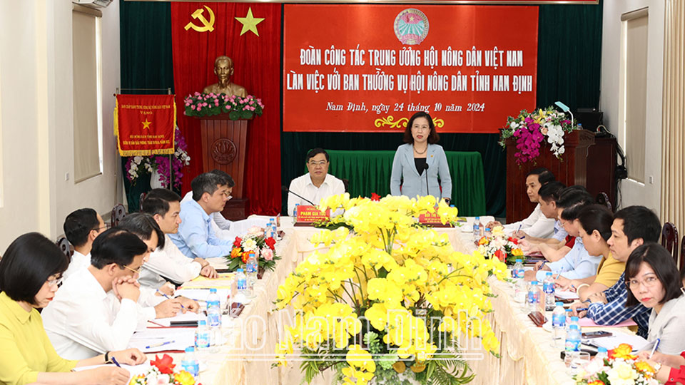 Kết luận buổi làm việc, đồng chí Phó Chủ tịch Trung ương Hội Nông dân Việt Nam Bùi Thị Thơm và đồng chí Phó Chủ tịch UBND tỉnh Trần Lê Đoài đã ghi nhận, biểu dương và đánh giá cao những kết quả Hội Nông dân tỉnh Nam Định đạt được trong thời gian qua; đồng thời nhấn mạnh các nhiệm vụ trọng tâm trong thời gian tới: Các cấp Hội Nông dân trong tỉnh tiếp tục đẩy mạnh tuyên truyền vận động hội viên, nông dân thực hiện các chủ trương, đường lối của Đảng, chính sách, pháp luật của Nhà nước, nhất là các chủ trương, chính sách về phát triển nông nghiệp, nông dân, nông thôn. Chú trọng đổi mới nội dung, phương thức hoạt động để thu hút hội viên tham gia tổ chức Hội. Tiếp tục phát động thực hiện tốt các phong trào nông dân, đặc biệt là phong trào “Nông dân thi đua sản xuất, kinh doanh giỏi, đoàn kết giúp nhau làm giàu và giảm nghèo bền vững”. Phối hợp các sở, ban, ngành, doanh nghiệp quan tâm, tổ chức hiệu quả các hoạt động dịch vụ, tư vấn, hỗ trợ cho nông dân. Tích cực tham gia xây dựng Đảng, xây dựng chính quyền, chủ động thực hiện tốt vai trò giám sát, phản biện xã hội, bảo vệ quyền và lợi ích hợp pháp, chính đáng của hội viên, nông dân, phát huy vai trò làm cầu nối giữa cấp ủy Đảng, chính quyền và nông dân.