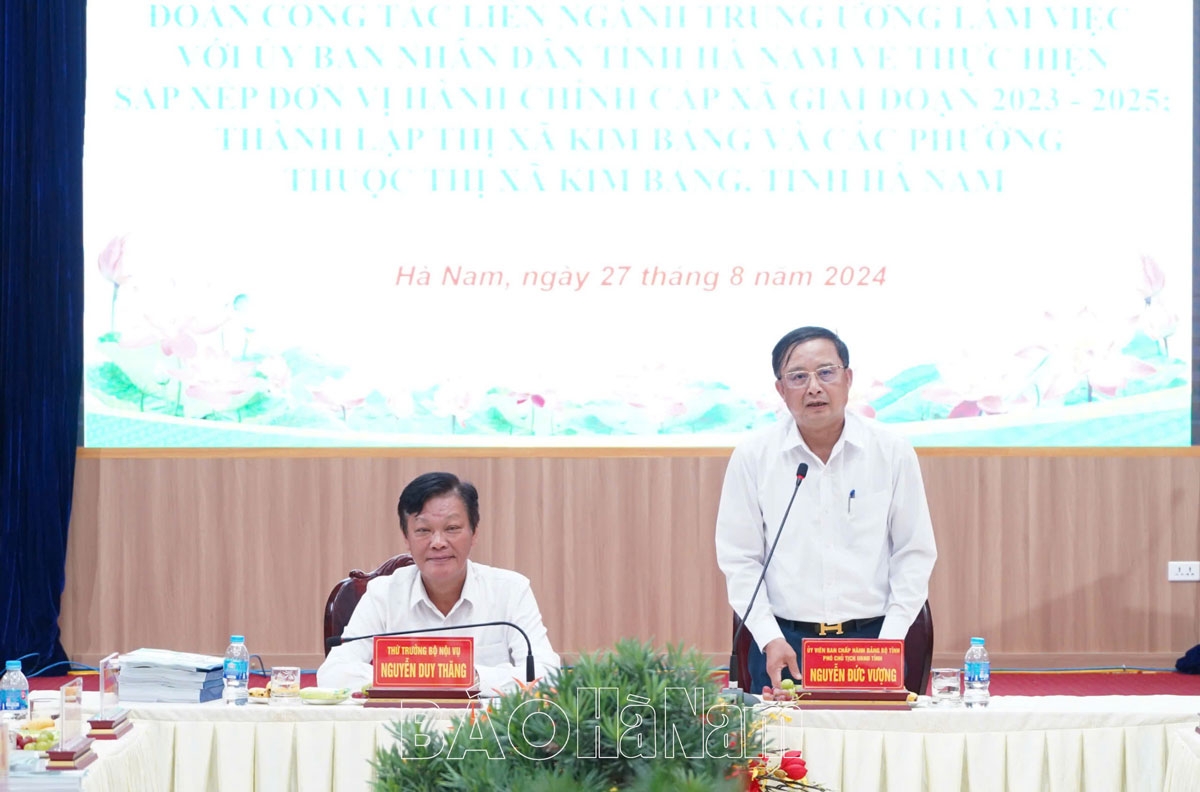 Sáng 27/8, Đoàn công tác liên ngành Trung ương do đồng chí Nguyễn Duy Thăng, Thứ trưởng Bộ Nội vụ làm trưởng đoàn đã có buổi làm việc với UBND tỉnh Hà Nam về thực hiện sắp xếp đơn vị hành chính (ĐVHC) cấp xã giai đoạn 2023-2025; thành lập thị xã Kim Bảng và các phường thuộc thị xã Kim Bảng, tỉnh Hà Nam. Tham gia đoàn công tác có đại diện một số cơ quan Trung ương: Bộ Nội vụ, Bộ Tài nguyên và Môi trường, Bộ Xây dựng, Bộ Lao động, Thương binh và Xã hội, Bộ Quốc phòng, Bộ Công an, Bộ Tư pháp, Văn phòng Chính phủ, Quốc hội…