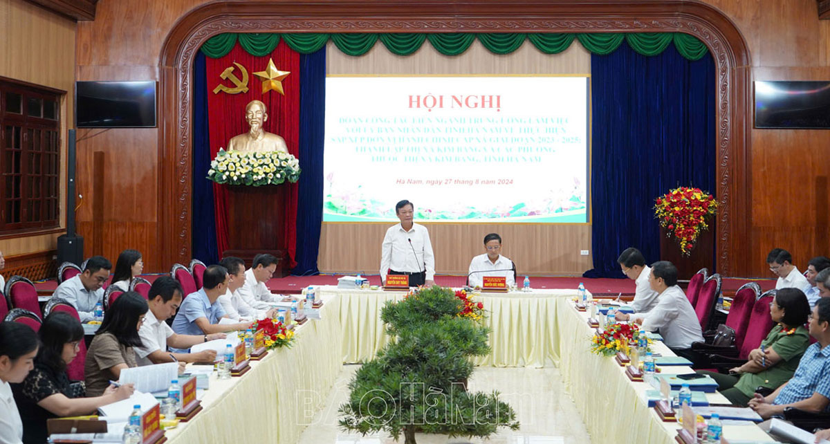 Phát biểu kết luận tại hội nghị, Thứ trưởng Bộ Nội vụ Nguyễn Duy Thăng bày tỏ ấn tượng với kết quả phát triển kinh tế - xã hội, đặc biệt là phát triển đô thị của tỉnh Hà Nam những năm gần đây. Đồng thời đề nghị địa phương tiếp thu đầy đủ những ý kiến góp ý của các thành viên đoàn công tác; tiếp tục tập trung cao độ để rà soát, điều chỉnh, bổ sung, thống nhất số liệu, hoàn thiện hồ sơ 2 đề án; nhanh chóng hoàn thiện thủ tục đề nghị Bộ Xây dựng và các bộ, ngành liên quan thẩm định và ban hành Quyết định về việc công nhận khu vực dự kiến thành lập phường thuộc thị xã Kim Bảng, tỉnh Hà Nam đạt tiêu chuẩn trình độ phát triển cơ sở hạ tầng đô thị loại IV; báo cáo Thủ tướng Chính phủ, ban hành Quyết định rà soát tiêu chí đô thị loại II đối với thành phố Phủ Lý và các khu vực dự kiến thành lập phường; thường xuyên kết nối, trao đổi với các bộ, ngành có liên quan để điều chỉnh, hoàn thiện hồ sơ… phấn đấu hoàn thiện hồ sơ trình Ủy ban Thường vụ Quốc hội vào tháng 9/2024.