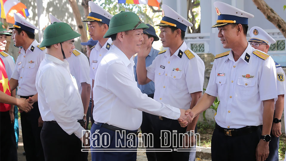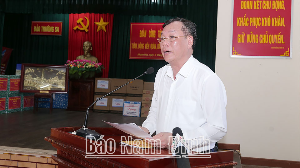 | Đồng chí Phó Bí thư Thường trực Tỉnh ủy Lê Quốc Chỉnh và các đồng chí lãnh đạo tỉnh tặng quà người con quê hương Nam Định đang làm việc tại đảo Đá Tây B. |