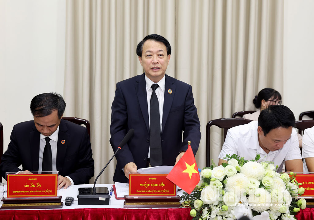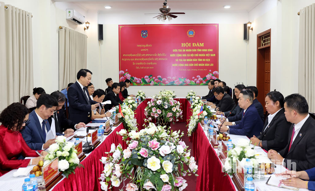 Phát biểu tại buổi làm việc, đồng chí Nguyễn Xuân Sơn, Tỉnh ủy viên, Chánh án TAND tỉnh Ninh Bình nhấn mạnh: Thực hiện Biên bản ghi nhớ hợp tác (ngày 22/8/2023) giữa TAND tỉnh Ninh Bình, Nước Cộng hòa xã hội chủ nghĩa Việt Nam và TAND tỉnh Bo Kẹo, Nước Cộng hòa Dân chủ Nhân dân Lào, TAND tỉnh Ninh Bình bày tỏ vui mừng được đón tiếp Đoàn công tác TAND tỉnh Bo Kẹo đến thăm và làm việc tại Ninh Bình. Đồng chí thông tin với đoàn về những tiềm năng, thế mạnh và những kết quả nổi bật trong phát triển kinh tế - xã hội của Ninh Bình; trao đổi, chia sẻ một số nội dung mà Đoàn công tác TAND tỉnh Bo Kẹo nước bạn Lào quan tâm về quản trị tòa án và quản lý vụ án như: tổ chức bộ máy và hoạt động của TAND hai cấp tỉnh Ninh Bình; khái quát kết quả thực hiện một số nhiệm vụ trọng tâm trong thời gian qua.