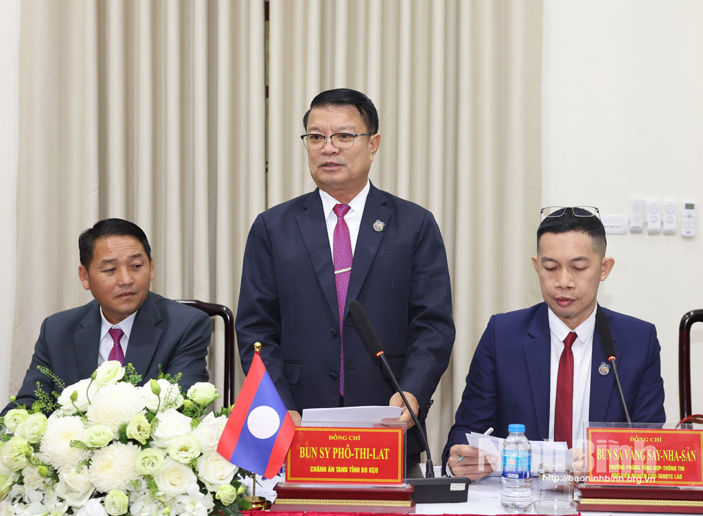 Thay mặt đoàn công tác, đồng chí Bun Sỷ Phô -Thi -Lat, Chánh án TAND tỉnh Bo Kẹo bày tỏ sự vui mừng mối quan hệ hữu nghị, đoàn kết, hợp tác toàn diện giữa TAND hai tỉnh ngày càng được củng cố, phát triển sâu rộng trên tất cả các lĩnh vực. Đồng chí trân trọng cảm ơn sự đón tiếp thịnh tình của TAND tỉnh Ninh Bình trong thời gian đoàn đến thăm, làm việc. Đồng thời, mong muốn TAND tỉnh Ninh Bình tiếp tục duy trì và tăng cường quan hệ hợp tác với TAND tỉnh Bo Kẹo; phối hợp thúc đẩy trao đổi đoàn các cấp theo hướng ngày càng hiệu quả, thực chất; chủ động tổ chức có hiệu quả các hoạt động trao đổi kinh nghiệm trong công tác xét xử, chia sẻ thông tin, hiểu biết về hệ thống pháp luật của hai nước liên quan đến tổ chức, hoạt động của Tòa án...