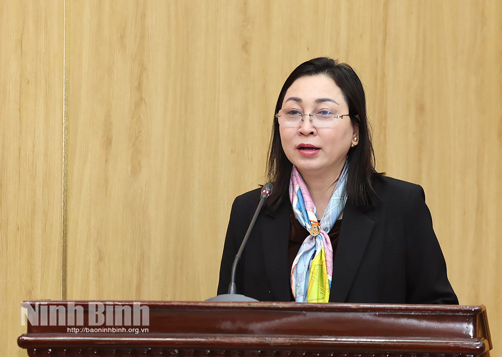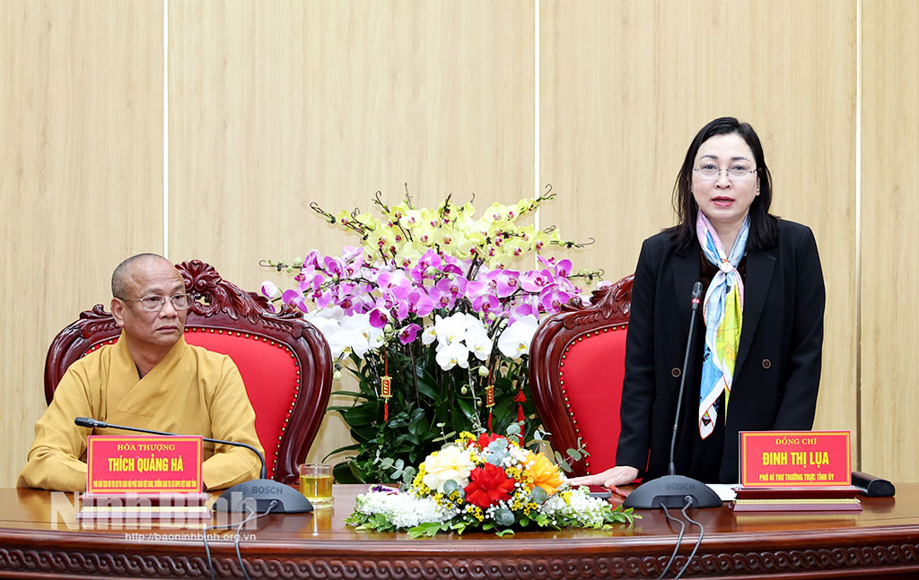 Thay mặt Tỉnh ủy, HĐND, UBND, Ủy ban MTTQ Việt Nam tỉnh, đồng chí Đinh Thị Lụa, Phó Bí thư Thường trực Tỉnh uỷ trân trọng cảm ơn những lời chúc mừng tốt đẹp và tình cảm của Đoàn đại biểu Ban Trị sự Giáo hội Phật giáo Việt Nam tỉnh dành cho tỉnh. Đồng chí nhấn mạnh: Năm 2025 là năm diễn ra nhiều sự kiện chính trị quan trọng đối với đất nước nói chung và đối với Đảng bộ, Chính quyền, Nhân dân tỉnh Ninh Bình nói riêng. Tỉnh ủy đã lãnh đạo toàn hệ thống chính trị trong tỉnh tập trung thực hiện nhiệm vụ kép: Vừa kiện toàn, ổn định tổ chức bộ máy theo đơn vị hành chính mới sau sắp xếp, vận hành chính quyền địa phương 2 cấp thông suốt, phục vụ Nhân dân; vừa chỉ đạo tổ chức tốt đại hội đảng bộ trực thuộc và chỉ đạo tổ chức thành công Đại hội đại biểu Đảng bộ tỉnh lần thứ I, nhiệm kỳ 2025-2030.