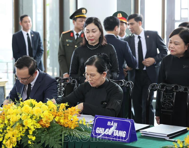 Đoàn đại biểu Đảng bộ tỉnh chia buồn cùng gia quyến Tổng Bí thư Nguyễn Phú Trọng.Đồng chí Lê Thị Thủy, Ủy viên Trung ương Đảng, Bí thư Tỉnh ủy, Chủ tịch HĐND tỉnh thay mặt đoàn ghi sổ tang tưởng niệm Tổng Bí thư Nguyễn Phú Trọng.