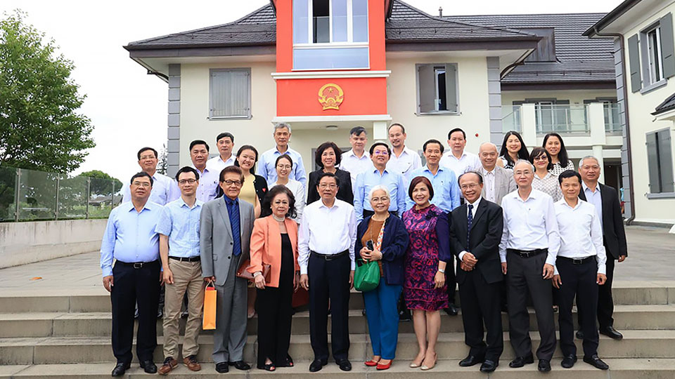 | Đồng chí Phan Đình Trạc cùng Đại sứ Phùng Thế Long và Đại sứ Lê Thị Tuyết Mai gặp mặt đại diện cộng đồng người Việt Nam tại Thụy Sĩ. |