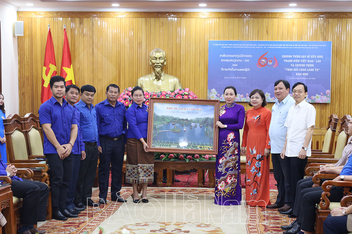 Thay mặt lãnh đạo tỉnh, đồng chí Phó Bí thư Thường trực Tỉnh ủyĐinh Thị Lụa trao tặng bức tranh lưu niệm cho Đoàn đại biểu Đoàn Thanh niên nhân dân cách mạng Lào nhân chuyến thăm và làm việc tại Hà Nam.Đoàn đại biểu Đoàn Thanh niên nhân dân cách mạng Lào trao quà kỷ niệm tặng lãnh đạo tỉnh Hà Nam.