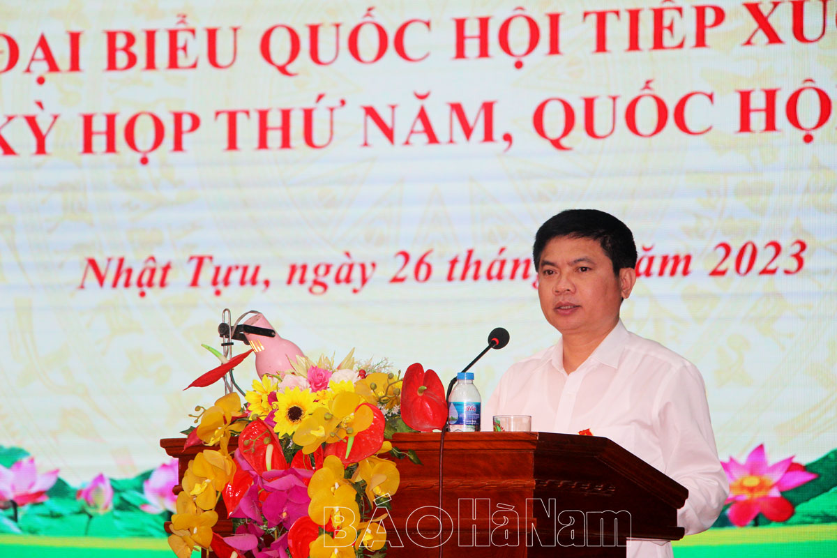 Thay mặt Đoàn ĐBQH tỉnh, đồng chí Trương Quốc Huy, Phó Bí thư Tỉnh ủy, Chủ tịch UBND tỉnh, Trưởng đoàn ĐBQH tỉnh đã thông báo những kết quả thực hiện nhiệm vụ phát triển kinh tế- xã hội, đảm bảo an ninh- quốc phòng của tỉnh trong năm 2022; những nhiệm vụ trọng tâm đã và đang được thực hiện trong năm 2023. Theo đó, toàn tỉnh nói chung và huyện Kim Bảng tập trung phát triển kinh tế, thu hút đầu tư, phát triển thương mại- dịch vụ, nâng cao nguồn nhân lực chất lượng cao, bảo tồn và phát triển các giá trị văn hóa…Để thực hiện được các nhiệm vụ này, bên cạnh sự quyết tâm và những giải pháp của tỉnh, của huyện, đồng chí Chủ tịch UBND tỉnh mong muốn cử tri và nhân dân xã Nhật Tựu nói riêng và huyện Kim Bảng nói chung có sự đồng thuận, ủng hộ các cấp, ngành thực hiện giải phóng mặt bằng xây dựng các khu công nghiệp, các dự án phát triển kinh tế, dự án xây dựng hạ tầng giao thông, đẩy mạnh phát triển đô thị…