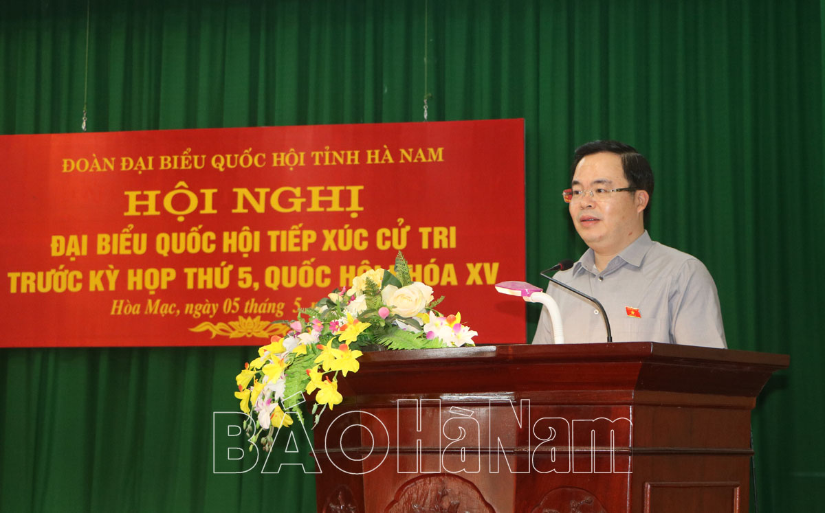 Tiếp tục chương trình tiếp xúc cử tri trước kỳ họp thứ 5 Quốc hội khóa XV, sáng 5/5, Tổ đại biểu Quốc hội tỉnh gồm các đồng chí: Phạm Hùng Thắng, TUV, Phó Trưởng Đoàn ĐBQH tỉnh; Trần Văn Khải, Ủy viên Thường trực Ủy ban KHCN & Môi trường của Quốc hội; Trần Thị Hiền, Chủ tịch HĐQT, Giám đốc Công ty CP Xây dựng & Phát triển Hạ tầng kĩ thuật tỉnh Hà Nam đã có buổi tiếp xúc với cử tri phường Hòa Mạc (Thị xã Duy Tiên). Cùng dự có đại diện Ủy ban MTTQ tỉnh, lãnh đạo một số sở, ban, ngành, đoàn thể của tỉnh cùng cấp ủy, chính quyền địa phương.