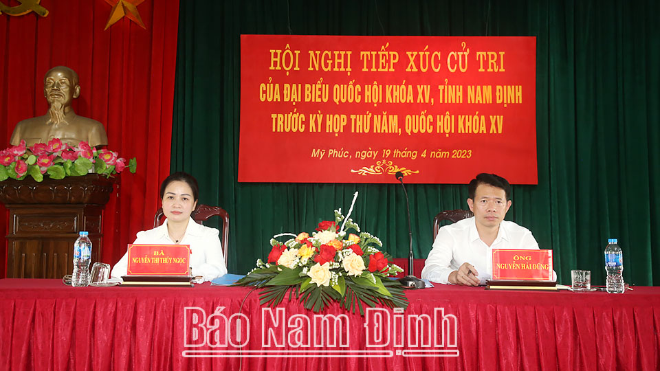 Tiếp tục chương trình tiếp xúc cử tri trước kỳ họp thứ 5, Quốc hội khóa XV, ngày 19-4, Đoàn đại biểu Quốc hội (ĐBQH) tỉnh đã đi tiếp xúc cử tri tại một số địa phương trong tỉnh. Các đồng chí: Lê Quốc Chỉnh, Phó Bí thư Thường trực Tỉnh uỷ, Chủ tịch HĐND tỉnh, Trưởng đoàn Đoàn ĐBQH tỉnh; Khương Thị Mai, Giám đốc điều hành Công ty TNHH Nhôm Nam Sung Việt Nam tiếp xúc cử tri huyện Hải Hậu. Các đồng chí: Nguyễn Hải Dũng, TUV, Phó Trưởng đoàn chuyên trách Đoàn ĐBQH tỉnh; Nguyễn Thị Thúy Ngọc, Chánh Văn phòng Hội LHPN tỉnh tiếp xúc cử tri các huyện Vụ Bản, Mỹ Lộc. Các đồng chí: Vũ Trọng Kim, Chủ tịch Hội Cựu Thanh niên xung phong Việt Nam và Trần Thị Quỳnh, giáo viên Trường THPT Nguyễn Khuyến (thành phố Nam Định) tiếp xúc cử tri huyện Xuân Trường. Dự các buổi tiếp xúc cử tri có lãnh đạo Ủy ban MTTQ tỉnh, Văn phòng Đoàn ĐBQH và HĐND tỉnh và các huyện.