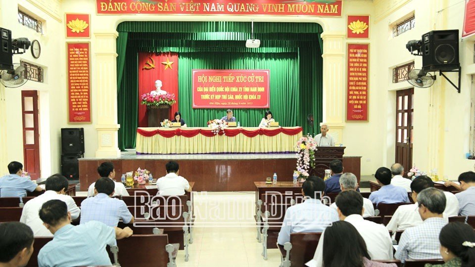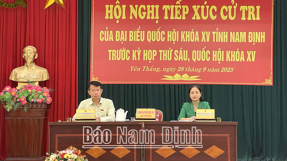 Tiếp tục chương trình tiếp xúc cử tri trước kỳ họp thứ 6, Quốc hội khóa XV, ngày 28-9, Đoàn đại biểu Quốc hội (ĐBQH) tỉnh đã đi tiếp xúc cử tri tại một số địa phương trong tỉnh. Các đồng chí: Lê Quốc Chỉnh, Phó Bí thư Thường trực Tỉnh uỷ, Chủ tịch HĐND tỉnh, Trưởng đoàn Đoàn ĐBQH tỉnh; Mai Thị Phương Hoa, Phó Chủ nhiệm Ủy ban Tư pháp của Quốc hội; Khương Thị Mai, Giám đốc điều hành Công ty TNHH Nhôm Nam Sung Việt Nam đã tiếp xúc cử tri huyện Hải Hậu. Các đồng chí: Nguyễn Hải Dũng, TUV, Phó Trưởng đoàn chuyên trách Đoàn ĐBQH tỉnh; Nguyễn Thị Thúy Ngọc, Chánh Văn phòng Hội LHPN tỉnh đã tiếp xúc cử tri huyện Ý Yên, Mỹ Lộc. Dự các buổi tiếp xúc cử tri có lãnh đạo Ủy ban MTTQ tỉnh, Văn phòng Đoàn ĐBQH và HĐND tỉnh và các huyện.