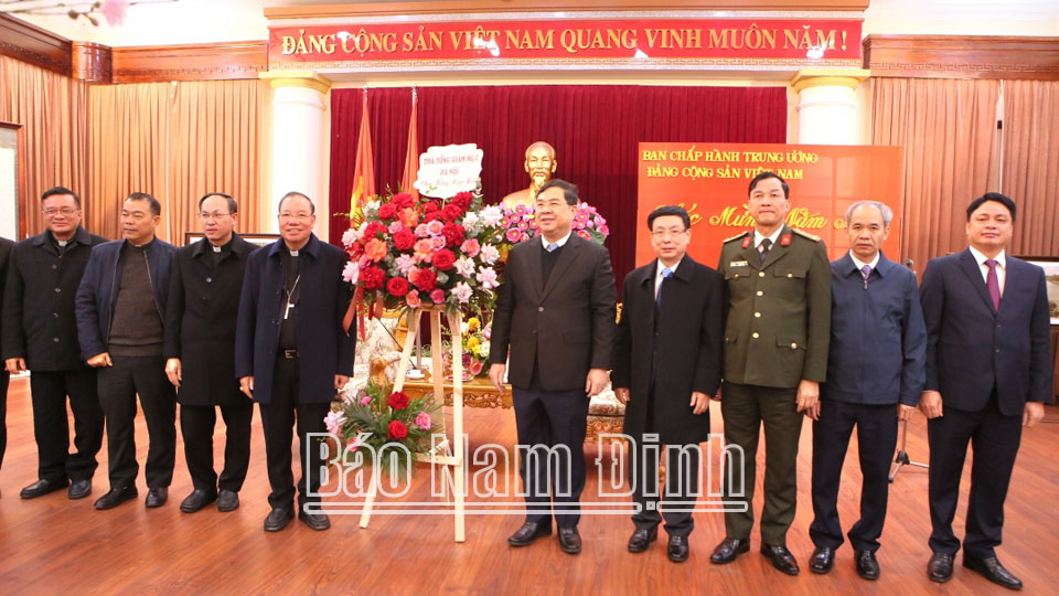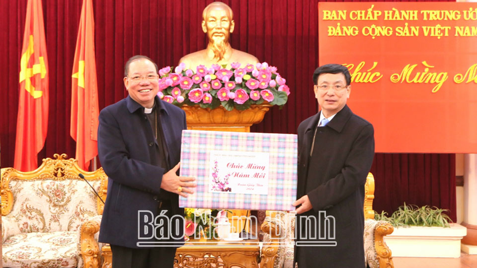 Nhân dịp đón năm mới Xuân Giáp Thìn 2024, đồng chí Bí thư Tỉnh ủy Phạm Gia Túc chúc Tổng Giám mục Giu-se Vũ Văn Thiên cùng các linh mục, tu sĩ và bà con giáo dân Tổng Giáo phận Hà Nội đón năm mới an vui, hạnh phúc; đồng thời thực hiện phương châm sống “tốt đời đẹp đạo”; luôn đồng hành cùng tỉnh trong các phong trào thi đua yêu nước, xây dựng, củng cố khối đại đoàn kết toàn dân tộc, chung sức xây dựng quê hương Nam Định ngày càng giàu đẹp, văn minh./.