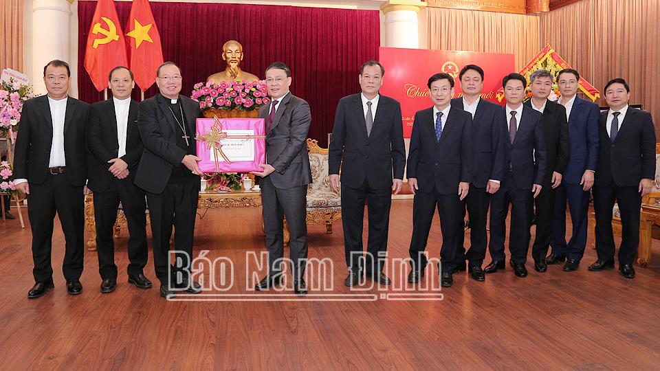 Nhân kỷ niệm 95 năm Ngày thành lập Đảng Cộng sản Việt Nam (3/2/1930 – 3/2/2025) và đón Tết Nguyên đán Ất Tỵ 2025, sáng 17/1, tại trụ sở Tỉnh ủy, các đồng chí: Đặng Khánh Toàn, Bí thư Tỉnh ủy; Lê Quốc Chỉnh, Phó Bí thư Thường trực Tỉnh ủy, Trưởng đoàn Đoàn đại biểu Quốc hội tỉnh, Chủ tịch HĐND tỉnh; Phạm Đình Nghị, Phó Bí thư Tỉnh ủy, Chủ tịch UBND tỉnh đã tiếp Đoàn đại biểu Tòa Tổng Giám mục Tổng giáo phận Hà Nội do Đức Tổng Giám mục Giuse Vũ Văn Thiên làm Trưởng đoàn đến chúc mừng. Cùng dự có các đồng chí Ủy viên Ban TVTU: Trần Minh Thắng, Chủ tịch Ủy ban MTTQ tỉnh; Phạm Duy Hưng, Trưởng Ban Dân vận Tỉnh ủy; Đại tá Nguyễn Hữu Mạnh, Giám đốc Công an tỉnh; lãnh đạo Văn phòng Tỉnh ủy, Sở Nội vụ và thành phố Nam Định.