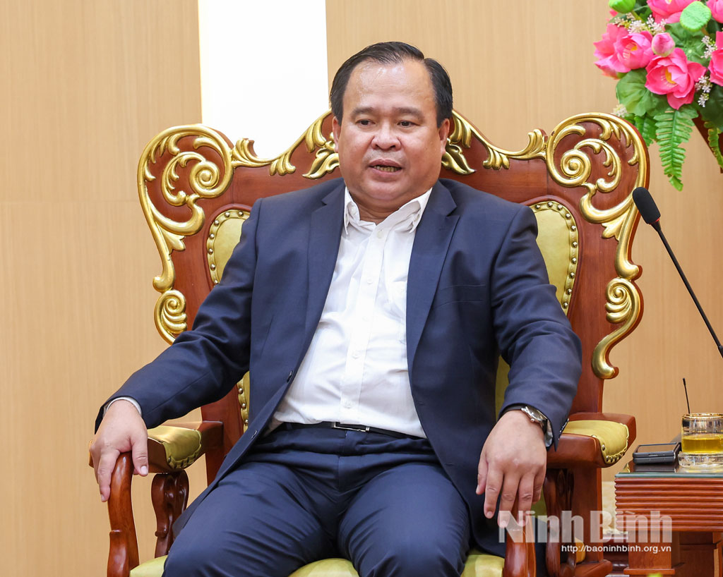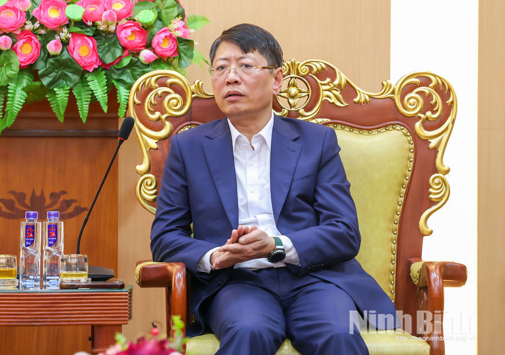 Đồng chí đã thông báo với đoàn những kết quả nổi bật trong phát triển kinh tế - xã hội của tỉnh Ninh Bình. Theo đó, năm 2025, năm đầu tiên sau sáp nhập tỉnh, Ninh Bình đã đạt những kết quả toàn diện trên tất cả các lĩnh vực: Kinh tế tiếp tục tăng trưởng khá, cơ cấu kinh tế chuyển dịch theo hướng tích cực, bền vững, tốc độ tăng trưởng kinh tế đạt 10,65%, đứng thứ 3/34 tỉnh, thành phố, vượt mục tiêu Thủ tướng Chính phủ giao; quy mô kinh tế ước đạt 342,8 nghìn tỷ đồng; GRDP bình quân đầu người đạt 89,19 triệu đồng. Du lịch tiếp tục khẳng định vị thế điểm đến hấp dẫn trong nước và quốc tế. Năm 2025, Ninh Bình ước đón hơn 19,4 triệu lượt khách, trong đó gần 2,2 triệu lượt khách quốc tế; doanh thu đạt 21,27 nghìn tỷ đồng, vượt kế hoạch, góp phần quan trọng thúc đẩy tăng trưởng kinh tế và quảng bá hình ảnh địa phương. An sinh xã hội được triển khai kịp thời, hiệu quả, chính sách đối với người có công, đối tượng bảo trợ xã hội, hộ nghèo được thực hiện đầy đủ; tỷ lệ hộ nghèo đa chiều giảm còn 0,96%...