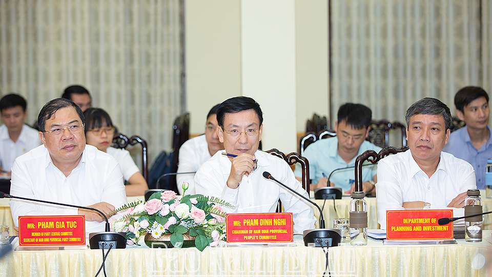 Tại buổi làm việc, đồng chí Chủ tịch UBND tỉnh Phạm Đình Nghị khẳng định, tỉnh luôn chủ động chuẩn bị các điều kiện thuận lợi, hỗ trợ tối đa các doanh nghiệp về tìm hiểu, đầu tư tại địa phương. Tỉnh đã chủ động lập và thực hiện hiệu quả các quy hoạch có liên quan. Hạ tầng giao thông đường bộ, đường sắt và đường thủy đang được đẩy mạnh đầu tư; riêng giao thông đường bộ trong 3 năm tới sẽ tương đối hoàn thiện, kết nối thông suốt đến các sân bay, cảng biển của các trung tâm vùng kinh tế và quốc gia. Nam Định cũng là một trong những địa phương đạt chất lượng cung ứng tốt nhất về hạ tầng điện lực, viễn thông trên toàn quốc. Tỉnh có lực lượng lao động trẻ dồi dào, được đào tạo tay nghề cao; có 4 trường đại học và 7 trường cao đẳng, đảm bảo đáp ứng kịp thời nhu cầu đào tạo lao động lành nghề cho doanh nghiệp. Một số KCN sẵn có còn quỹ đất để thu hút nhà đầu tư thứ cấp gồm: Dệt may Rạng Đông, Bảo Minh mở rộng, Mỹ Thuận, Trung Thành, Hồng Tiến… Trong đó KCN Dệt may Rạng Đông đáp ứng nhu cầu đầu tư lĩnh vực dệt may, da giày; các KCN khác được định hướng ưu tiên thu hút đầu tư các doanh nghiệp lớn, sử dụng công nghệ hiện đại, thân thiện môi trường, chú trọng các ngành sản xuất điện, điện tử, phụ tùng thiết bị phụ trợ, cơ khí.
