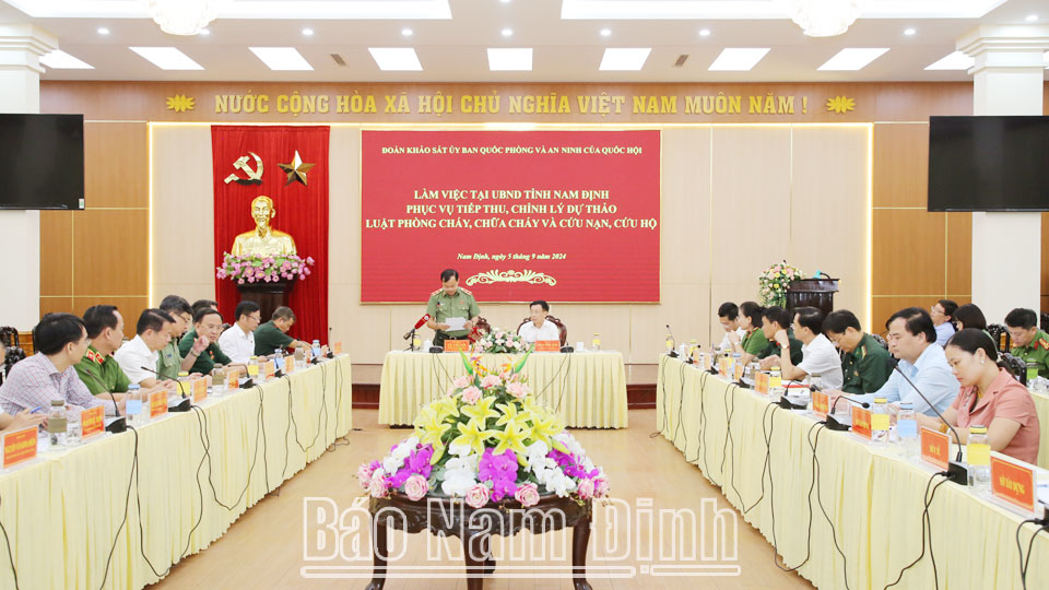 Sáng 5/9, Đoàn khảo sát Ủy ban Quốc phòng và An ninh của Quốc hội do đồng chí Trung tướng Lê Tấn Tới, Uỷ viên BCH Trung ương Đảng, Uỷ viên Uỷ ban Thường vụ Quốc hội, Chủ nhiệm Uỷ ban Quốc phòng và An ninh của Quốc hội làm Trưởng đoàn đã làm việc với UBND tỉnh phục vụ tiếp thu, chỉnh lý Dự thảo Luật Phòng cháy, chữa cháy (PCCC) và cứu nạn, cứu hộ (CNCH).