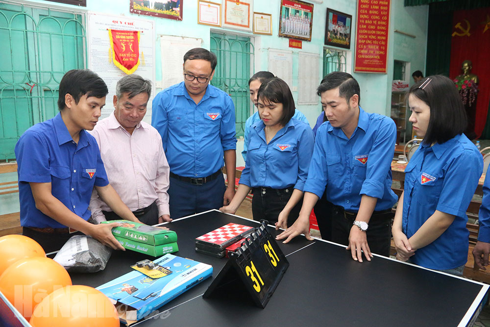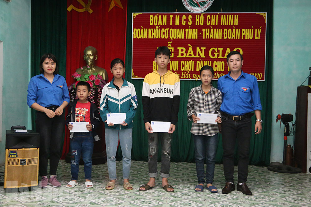 Đại diện 2 đơn vị tặng những vật dụng thể thao cho thanh, thiếu nhi thôn Nội Ngoại, xã Tiên Hải (thành phố Phủ Lý).Đại diện tuổi trẻ 2 đơn vị tặng quà cho các cháu học sinh nghèo vượt khó, học giỏi tại địa phương.