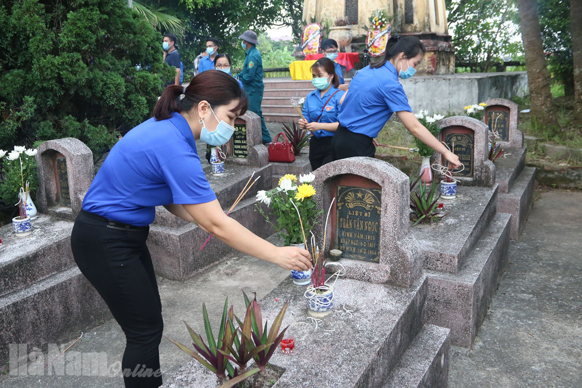 Sau khi thăm, tặng quà các Mẹ Việt Nam anh hùng, Đoàn đã tổ chức dâng hương, dâng hoa và thắp nến tri ân tại Nghĩa trang Liệt sĩ xã Tiến Thắng (Lý Nhân).