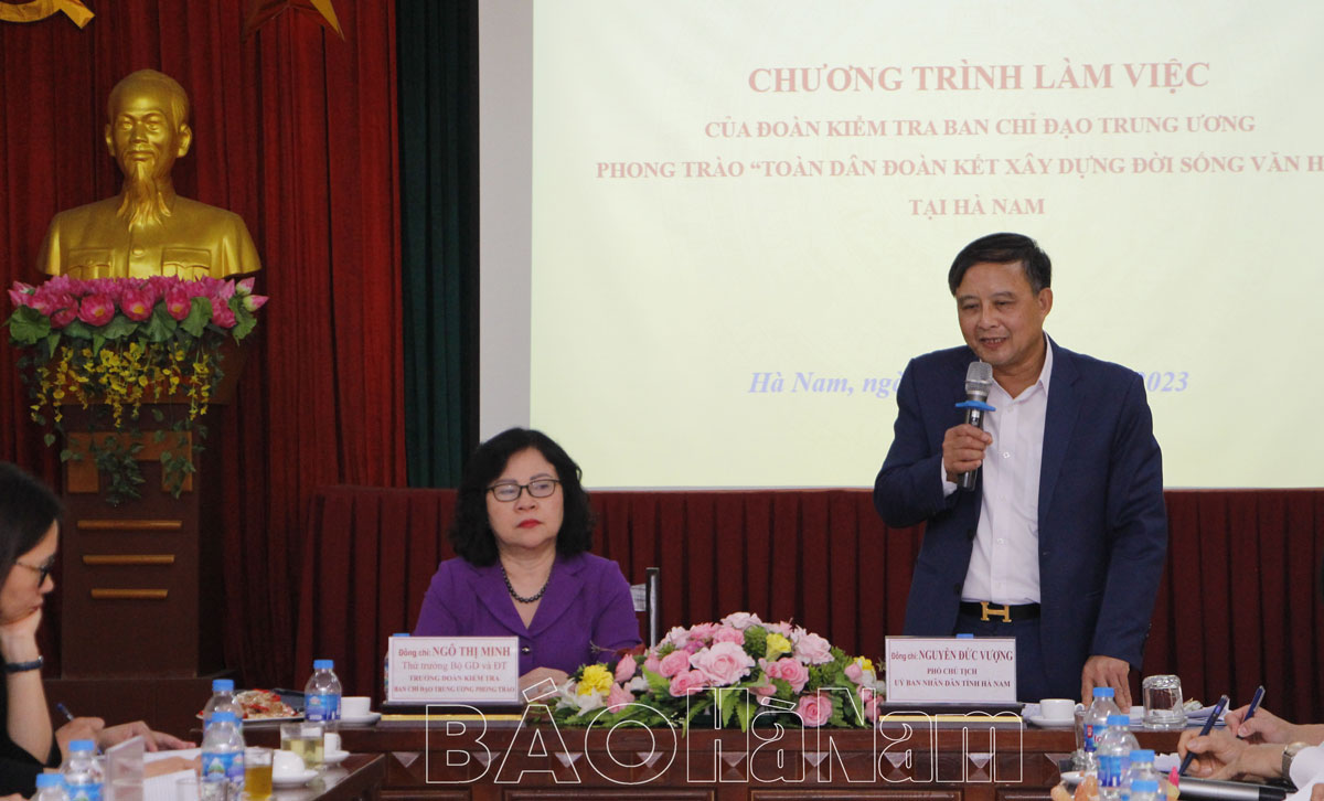 Chiều ngày 2/11, Đoàn kiểm tra Ban Chỉ đạo (BCĐ) Trung ương Phong trào “Toàn dân đoàn kết xây dựng đời sống văn hóa” (TDĐKXDĐSVH) do Thứ trưởng Bộ Giáo dục và Đào tạo (GD&ĐT) Ngô Thị Minh làm trưởng đoàn đã về làm việc tại Hà Nam.