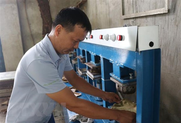Anh Nguyễn Văn Tuyến ép lá nho biển vào khuôn tạo hình chiếc đĩa. (Ảnh: Phạm Cường/TTXVN)