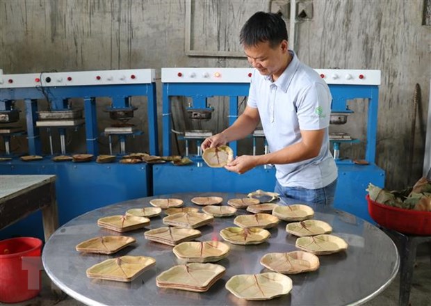 Chiếc đĩa bằng lá có vân rất đẹp, sử dụng được 10 lần thay thế nhựa dùng một lần. (Ảnh: Phạm Cường/TTXVN)