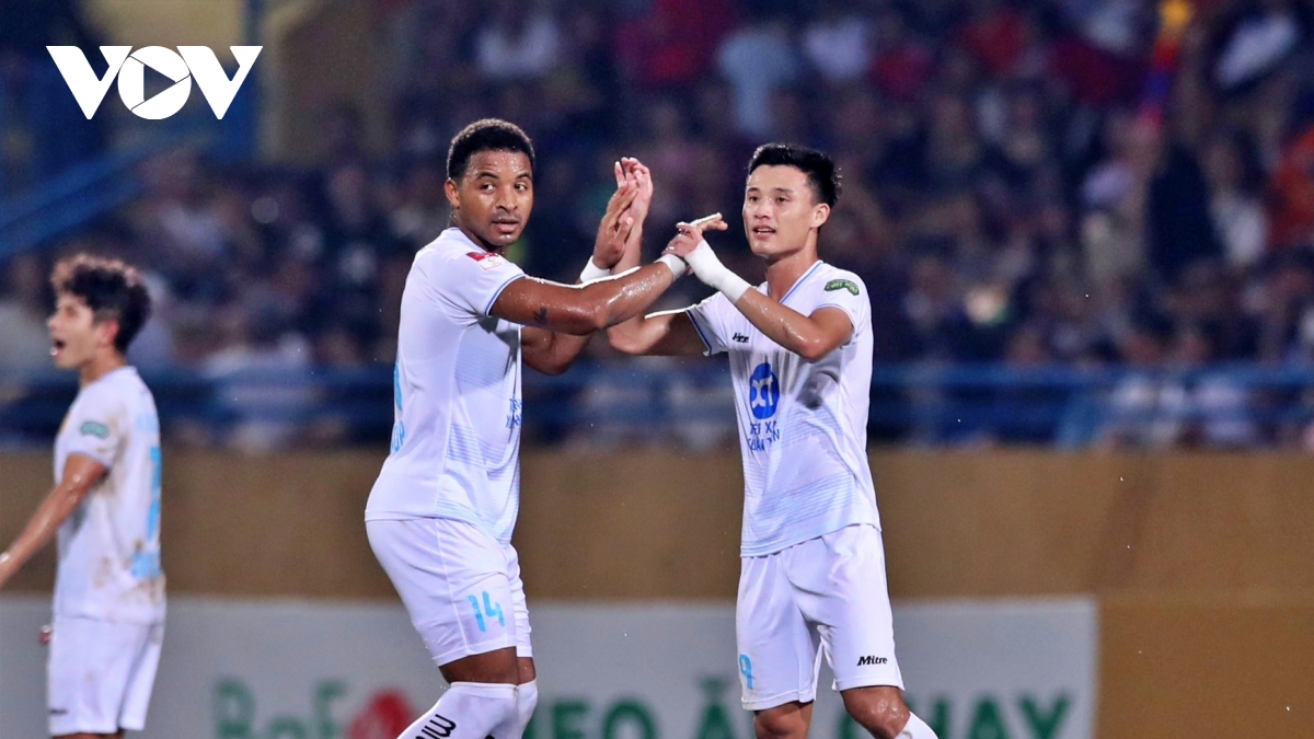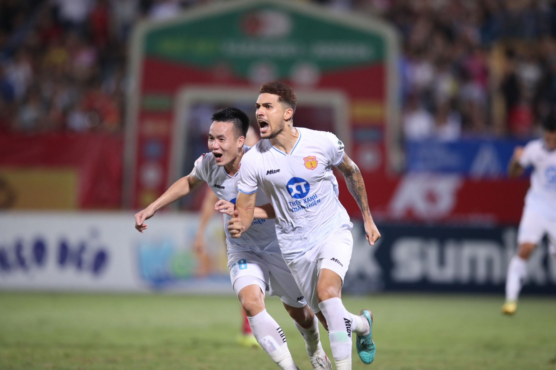 | Hendrio đã đánh bại được Nguyễn Filip để ghi bàn nâng tỉ số lên 3-2 cho Nam Định. |