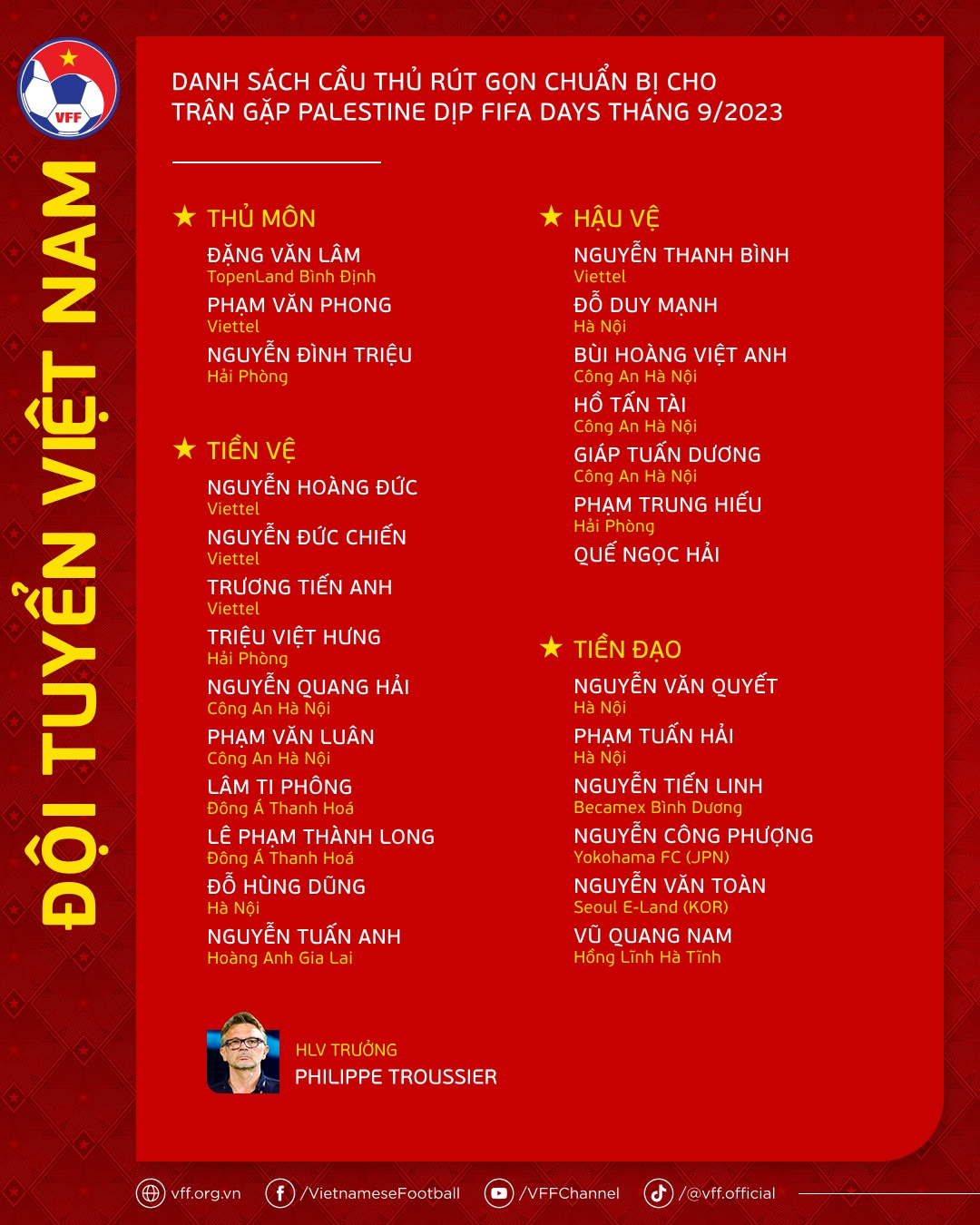 Về đội tuyển Việt Nam, HLV Troussier cũng vừa công bố danh sách gồm 26 cầu thủ sẽ góp mặt trong cuộc so tài với đội Palestine. Bên cạnh những cái tên sắm vai trụ cột dưới thời HLV Park Hang-seo trước đây, một số nhân tố mới đã được điền vào danh sách chính thức.