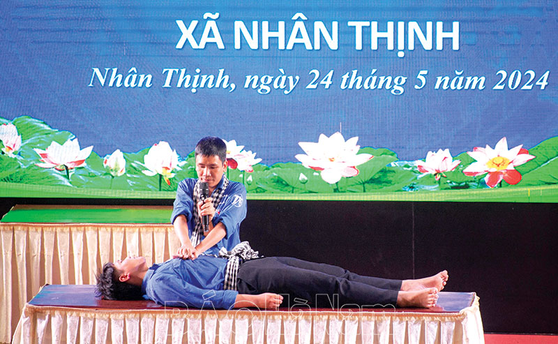 Anh Vũ Quang Huy Đội trưởng Đội TNTN Lý Nhân hướng dẫn sơ cứu khi gặp tai nạn đuối nước trong buổi tuyên truyền phòng, tránh đuối nước ở xã Nhân Thịnh.