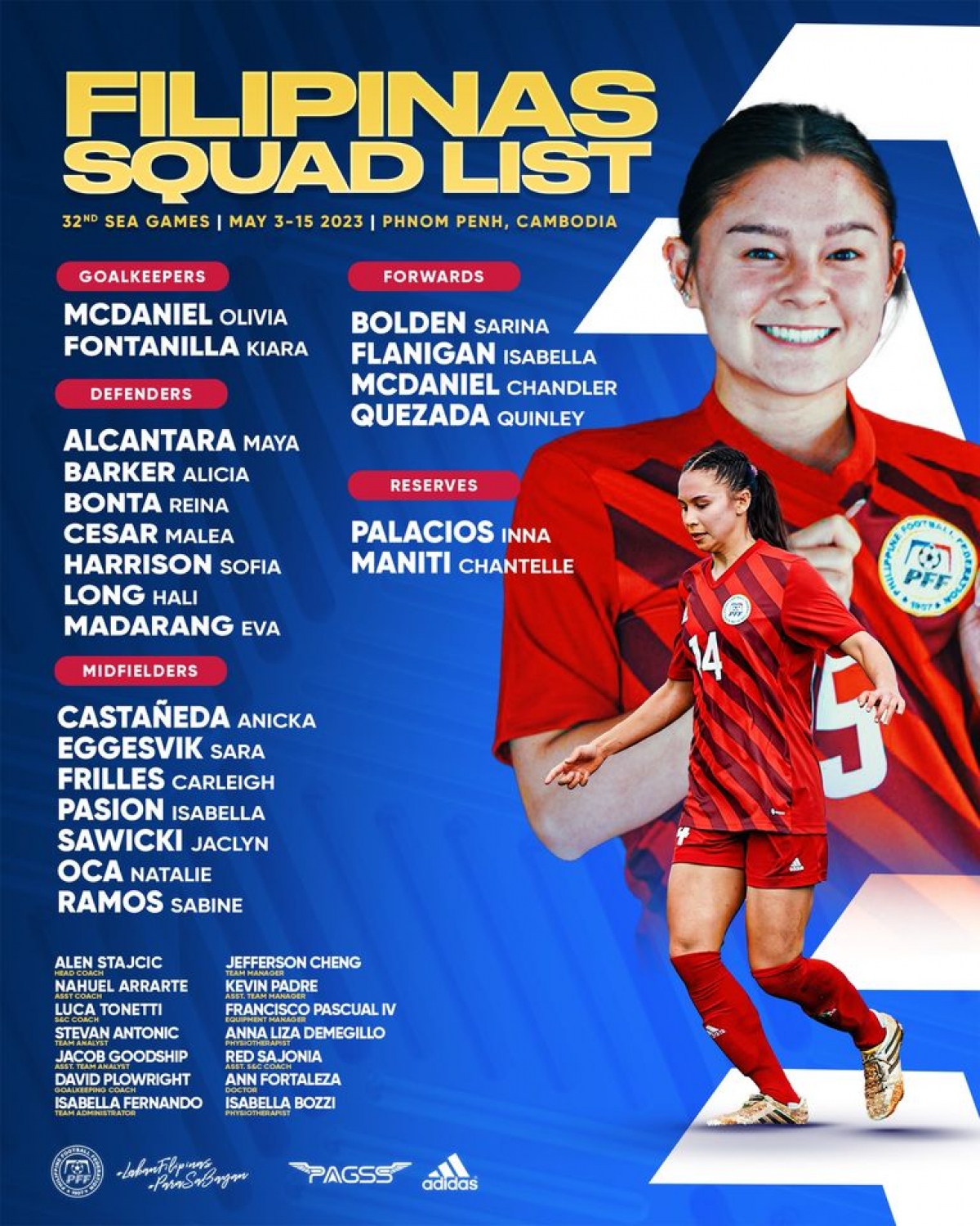 Hầu hết trong số các cầu thủ Philippines dự SEA Games lần này đều nằm trong thành phần đội bóng đã vào đến bán kết Asian Cup nữ 2022 và giành quyền dự World Cup nữ 2023. Ngoài ra, HLV người Australia - Alen Stajcic còn bổ sung một số cầu thủ mới như Maya Alcantara hay Reina Bonta.