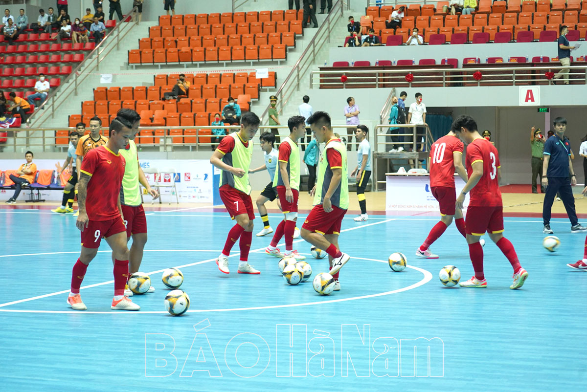 Hai đội khởi động trước trận đấu.Không khí tại Nhà thi đấu TDTT tỉnh Hà Nam trước trận ĐT Futsal Việt Nam gặp ĐT Malaysia.