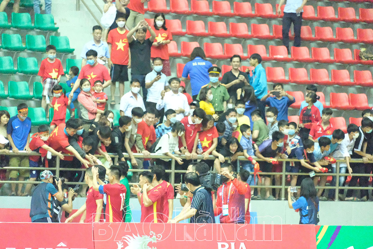 Các cầu thủ Đội tuyển Futsal nam Việt Nam cảm ơn các cổ động viên trên khán đài.Hai đội bắt tay nhau sau khi kết thúc trận đấu.Các cầu thủ ĐT Việt Nam ăn mừng sau trận đấu.