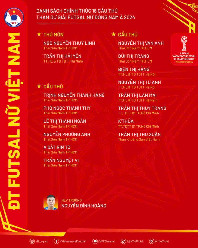 Danh sách chính thức 16 tuyển thủ futsal nữ Việt Nam tham dự Giải vô địch futsal Đông Nam Á 2024. (Ảnh: VFF)