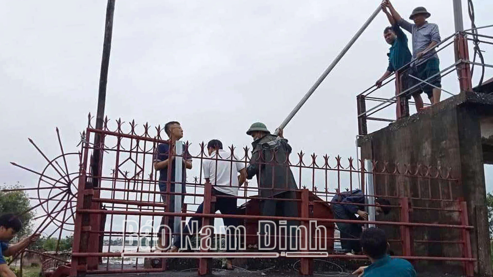 | Các lực lượng chức năng và người dân xã Nghĩa Hồng (Nghĩa Hưng) đang gia cố cống Đồn. Ảnh:Bùi Luận