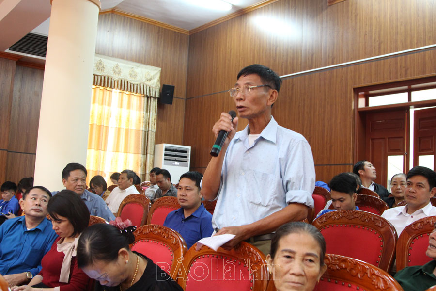 Với tinh thần thẳng thắn, dân chủ và tin tưởng, cán bộ đoàn thể thôn, tổ dân phố và nhân dân trong huyện phát biểu ý kiến kiến nghị đồng chí Bí thư Huyện uỷ và Chủ tịch UBND huyện các vấn đề như: Chủ trương, giải pháp để bảo đảm chức danh chủ tịch hội CCB các xã, thị trấn được chuẩn hóa, góp phần nâng cao chất lượng hoạt động của hội; giải pháp về việc xử lý chất thải chăn nuôi và việc kinh doanh gia súc tự phát, thiếu quy hoạch, gây ô nhiễm môi trường, ảnh hưởng tới sức khoẻ của nhân dân; quan tâm lãnh đạo, chỉ đạo và hỗ trợ đầu tư kinh phí, các trang thiết bị bảo đảm thực hiện tốt công tác vệ sinh môi trường trên địa bàn. Đặc biệt, chất lượng nước sạch có thời điểm chưa bảo đảm, gây lo lắng, bức xúc trong nhân dân. Do vậy, đề nghị người đứng đầu địa phương có các giải pháp lãnh đạo, chỉ đạo để chất lượng nước sạch trên địa bàn huyện đạt tiêu chuẩn. Về lĩnh vực quân sự, đề nghị đồng chí Bí thư Huyện uỷ, Chủ tịch UBND huyện có định hướng chỉ đạo cụ thể nhằm nâng cao trách nhiệm của lãnh đạo địa phương và ý thức của người dân, đặc biệt là thanh niên trong việc thực hiện Luật Nghĩa vụ quân sự; giải pháp định hướng nghề nghiệp, kết nối người lao động với doanh nghiệp, góp phần giải quyết việc làm cho người lao động, nhất là thanh niên nông thôn; quan tâm hỗ trợ cơ sở vật chất cho hội cấp xã để các chi hội thuận tiện trong việc tiếp nhận thông tin và định hướng hoạt động của hội cấp trên, thực hiện khâu đột phá về ứng dụng công nghệ thông tin trong hoạt động hội; quan tâm hỗ trợ kinh phí, tháo gỡ khó khăn cho 2 thôn trên địa bàn xã Bình Nghĩa nói riêng và các thôn, tổ dân phố khác trên địa bàn huyện nói chung khi xây dựng nhà văn hóa. Tăng cường tuyên truyền, nâng cao nhận thức, ý thức phòng ngừa tội phạm lừa đảo chiếm đoạt tài sản trên không gian mạng cho người dân. Đề nghị Huyện ủy, UBND huyện quan tâm lãnh đạo, chỉ đạo thực hiện giải pháp hỗ trợ các hợp tác xã, tổ hợp tác hoạt động hiệu quả hơn; giải pháp đầu ra cho sản phẩm nông nghiệp và có những bước đột phá mới, nâng cao hơn nữa giá trị sản xuất nông nghiệp...