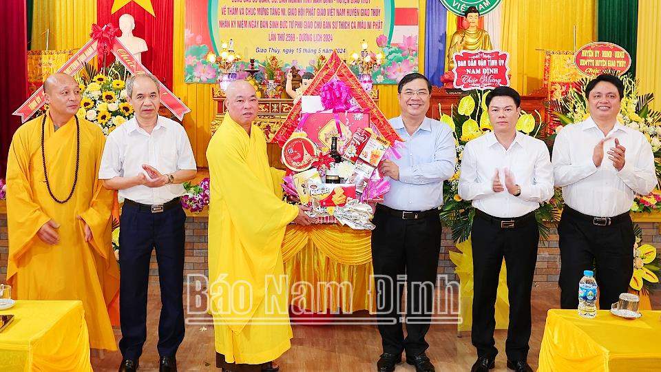 Thay mặt Tỉnh ủy, HĐND, UBND, Ủy ban MTTQ Việt Nam tỉnh, đồng chí Bí thư Tỉnh ủy Phạm Gia Túc gửi lời chúc tốt đẹp đến các vị chức sắc cùng các tín đồ phật tử trên địa bàn tỉnh Nam Định nói chung, huyện Giao Thủy nói riêng đón mùa Phật đản an vui, hạnh phúc. Đồng chí Bí thư Tỉnh ủy khẳng định, những năm qua, tỉnh Nam Định đã đạt được nhiều kết quả, thành tựu quan trọng trên lĩnh vực công tác xây dựng Đảng, xây dựng hệ thống chính trị, phát triển kinh tế - xã hội, bảo đảm quốc phòng - an ninh. Đóng góp vào kết quả, thành tích chung của tỉnh có sự nỗ lực, cố gắng của các cấp, các ngành, các tầng lớp nhân dân, các tôn giáo, trong đó có đồng bào Phật giáo. Nam Định là một trong những địa phương có đông chức sắc, tu sĩ, phật tử trong cả nước. Vì thế, cấp ủy, chính quyền, các tổ chức chính trị - xã hội tỉnh luôn đồng hành cùng Ban Trị sự Giáo hội Phật giáo tỉnh nhằm thực hiện công tác Phật sự cũng như triển khai các hoạt động an sinh xã hội.