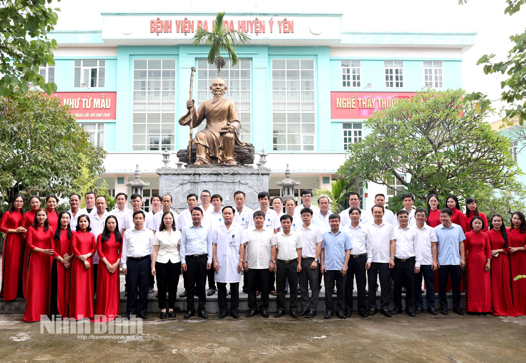 Đồng chí Bí thư Tỉnh ủy Đặng Xuân Phong cùng đoàn công tác chụp ảnh lưu niệm với lãnh đạo, y bác sĩ Trung tâm Y tế Ý Yên.