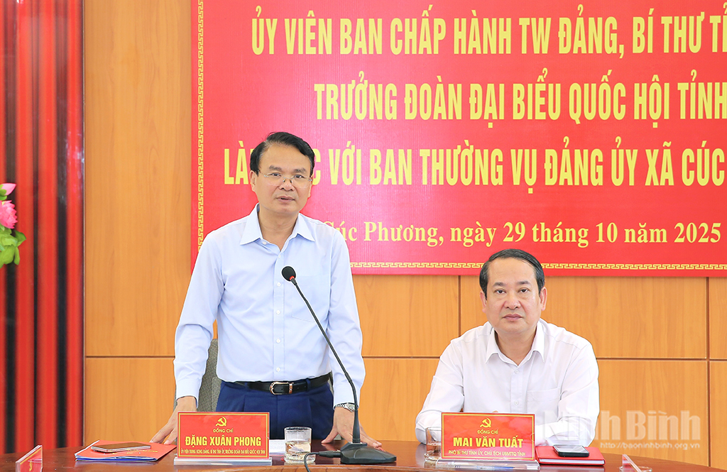 Phát biểu chỉ đạo tại buổi làm việc, đồng chí Bí thư Tỉnh ủy Đặng Xuân Phong đã ghi nhận, biểu dương nỗ lực, tinh thần đoàn kết và trách nhiệm của Đảng ủy xã Cúc Phương trong việc nhanh chóng ổn định tổ chức, vận hành hiệu quả chính quyền địa phương hai cấp sau sáp nhập. Đồng chí khẳng định, Cúc Phương là địa bàn đặc thù của tỉnh, có vị trí quan trọng về sinh thái, quốc phòng và phát triển kinh tế - xã hội. Với hơn 85% diện tích là rừng, 50% dân số là đồng bào dân tộc thiểu số, nơi đây còn có Vườn Quốc gia Cúc Phương - vườn quốc gia đầu tiên của Việt Nam, 6 năm liên tiếp được vinh danh “Vườn quốc gia hàng đầu châu Á”. Đây vừa là khó khăn, thách thức, vừa là lợi thế lớn nếu địa phương biết khai thác hài hòa giữa phát triển kinh tế và bảo tồn thiên nhiên, văn hóa.