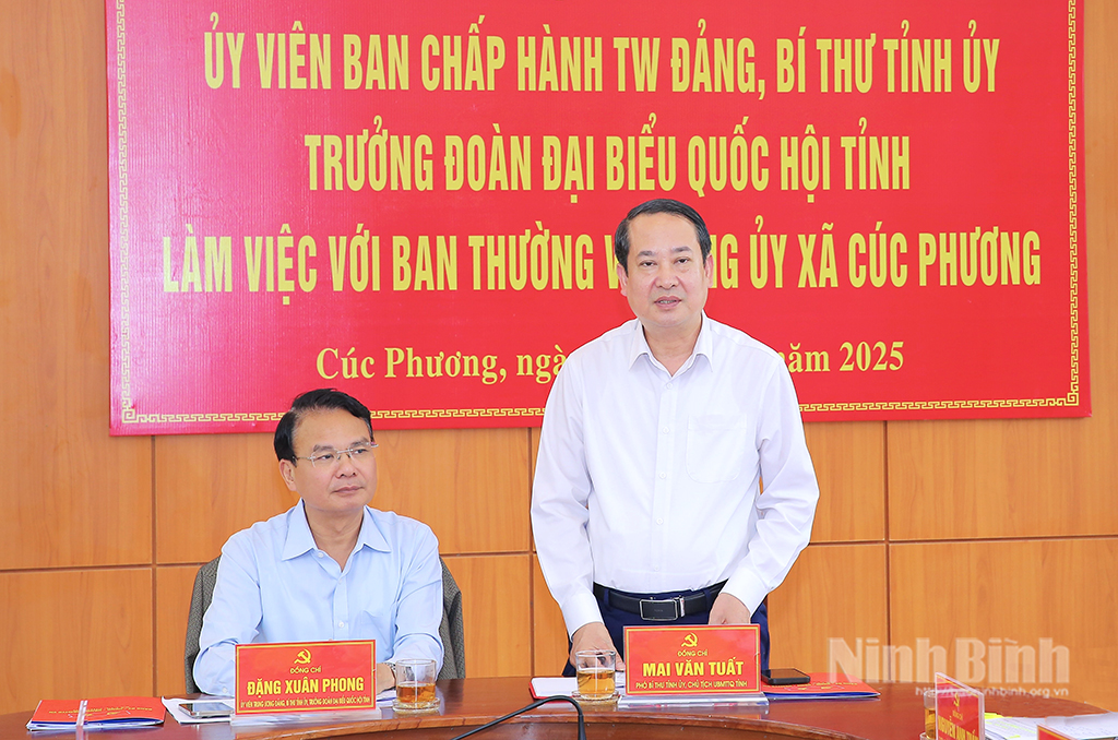 Tại buổi làm việc, đồng chí Mai Văn Tuất, Phó Bí thư Tỉnh ủy, Chủ tịch Ủy ban MTTQ Việt Nam tỉnh ghi nhận, đánh giá cao sự đoàn kết, nỗ lực và cách làm chủ động, sáng tạo của Đảng ủy xã Cúc Phương ngay sau khi sắp xếp đơn vị hành chính; đồng thời nhấn mạnh xã là địa phương có dư địa lớn để phát triển du lịch sinh thái, văn hóa và dịch vụ cộng đồng, vì vậy cần sớm xây dựng các nghị quyết chuyên đề, ban hành chương trình hành động cụ thể, tập trung khai thác hiệu quả tiềm năng, lợi thế của địa phương; chú trọng công tác xây dựng Đảng, phát triển đảng viên, nhất là đảng viên người dân tộc thiểu số, xây dựng bộ máy chính quyền trong sạch, vững mạnh, đáp ứng yêu cầu trong giai đoạn mới.