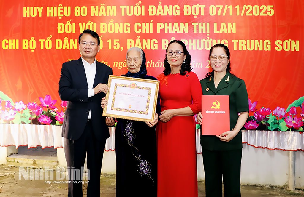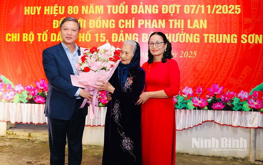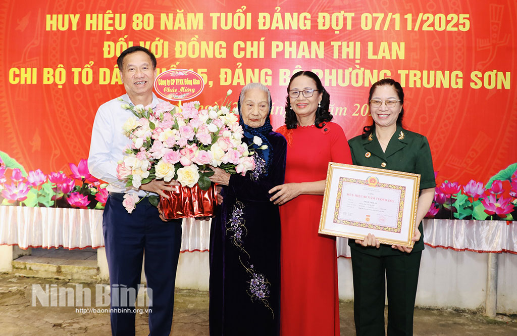 Đồng chí Bí thư Tỉnh ủy Đặng Xuân Phong đã trao tặng Huy hiệu 80 tuổi Đảng và tặng hoa chúc mừng đảng viên Phan Thị Lan, nguyên cán bộ Nông trường Đồng Giao, người vinh dự được gặp Chủ tịch Hồ Chí Minh năm 1960 khi Người về thăm nông trường. Trong suốt quá trình tham gia hoạt động cách mạng, lao động sản xuất từ năm 1945, từng đảm nhận nhiều chức danh: Ủy viên Ủy ban khởi nghĩa giành chính quyền; Hội trưởng Hội phụ nữ xã Hương Xuân, tỉnh Hà Tĩnh; Bí thư Chi bộ, đội trưởng đội chăn nuôi, Ủy viên Ban chấp hành Công đoàn đội Yên Khánh, Nông trường Đồng Giao, dù ở cương vị nào, đồng chí cũng luôn hoàn thành xuất sắc nhiệm vụ và vinh dự được tặng danh hiệu “Đảng viên 4 tốt”, “Dũng sĩ Khe Xanh”, “Lao động tiên tiến”, “Phụ nữ ba đảm đang” và nhiều giấy khen của các cấp các ngành. Khi nghỉ hưu, đồng chí luôn thể hiện tinh thần tiên phong, gương mẫu, là tấm gương tiêu biểu về “tuổi cao gương sáng” của địa phương.