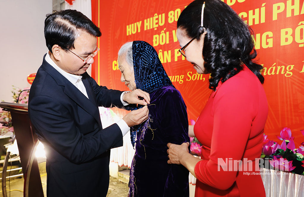 Đồng chí Đặng Xuân Phong, Ủy viên Trung ương Đảng, Bí thư Tỉnh ủy, Trưởng Đoàn đại biểu Quốc hội tỉnh trao tặng Huy hiệu 80 năm tuổi Đảng cho đảng viên Phan Thị Lan, chi bộ Tổ dân phố 15, phường Trung Sơn.