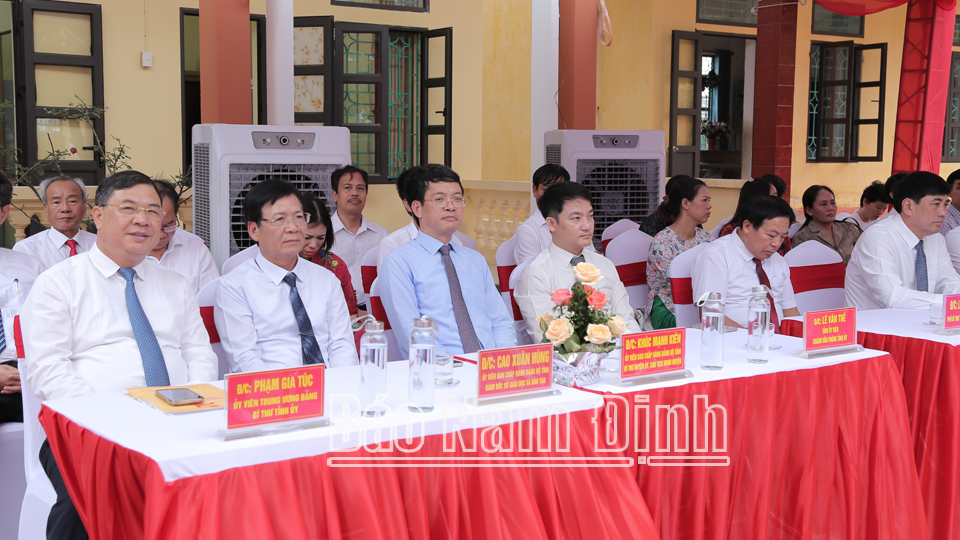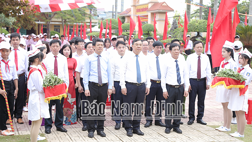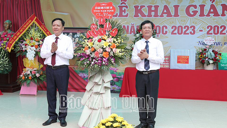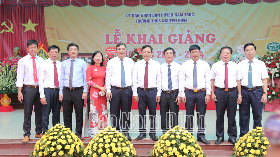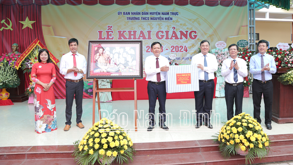 | Đồng chí Bí thư Tỉnh ủy Phạm Gia Túc và lãnh đạo Sở GD - ĐT, huyện Nam Trực tặng lẵng hoa tươi thắm chúc mừng Trường THCS Nguyễn Hiền. |