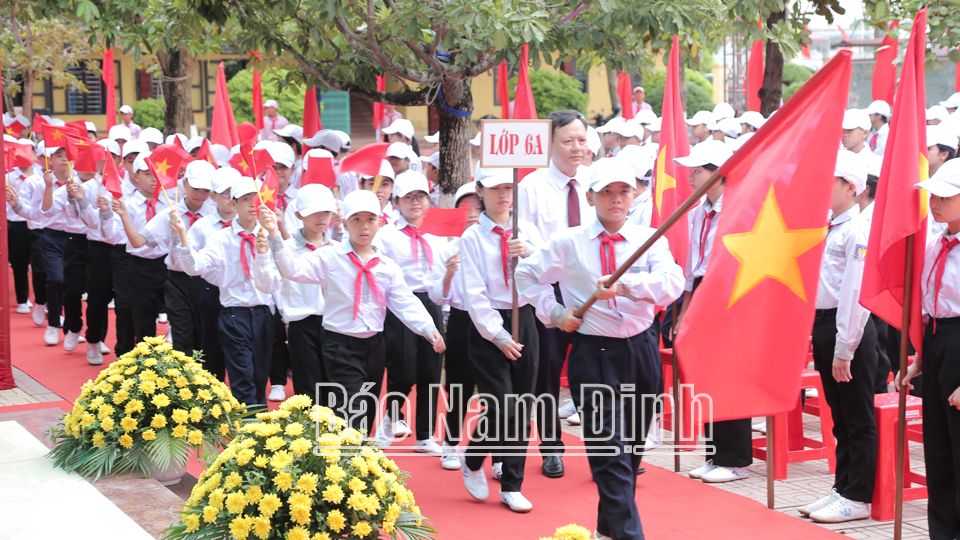 | Học sinh lớp 6 hân hoan chào đón năm học mới. |