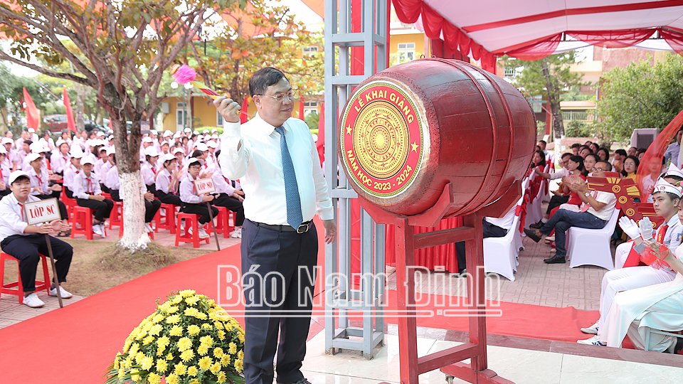 | Đồng chí Bí thư Tỉnh ủy Phạm Gia Túc đánh trống khai giảng năm học mới. |