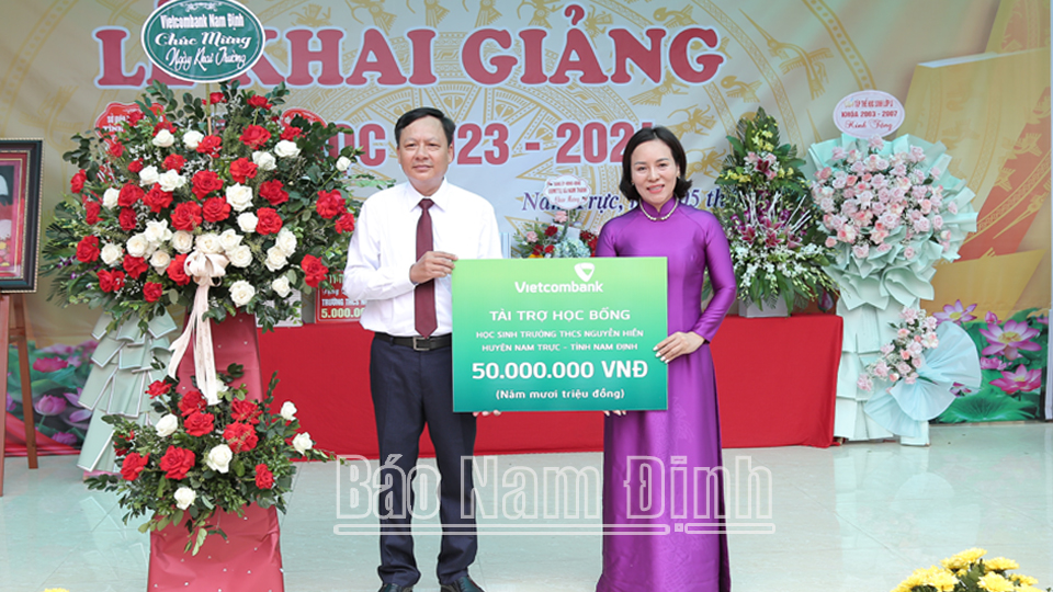 Nhân dịp này Ngân hàng Vietcombank chi nhánh Nam Định đã trao 50 suất học bổng, mỗi suất 1 triệu đồng cho học sinh nghèo vượt khó học giỏi của Trường THCS Nguyễn Hiền./.