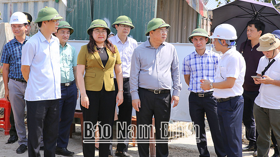 | Đồng chí Bí thư Tỉnh ủy Phạm Gia Túc và đoàn công tác của tỉnh kiểm tra tiến độ xây dựng cầu vượt sông Đào nối từ đường Song Hào đến đường Vũ Hữu Lợi, thành phố Nam Định. |