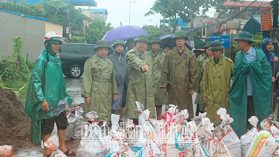 Tại huyện Nam Trực, đồng chí Bí thư Tỉnh ủy đến kiểm tra bối Đại An, xã Nghĩa An, nơi đang bị nước rò qua, gây nguy cơ sạt lở. Huyện Nam Trực đang khẩn trương huy động lực lượng, máy móc, cọc tre để gia cố, đồng thời có phương án di dời người dân vào nơi an toàn. Kiểm tra tại Xí nghiệp gạch Nam An, nơi nước đang tràn qua bối, đe dọa trực tiếp đến sự an toàn của khu vực sản xuất và các hộ dân lân cận, đồng chí Bí thư Tỉnh ủy nhấn mạnh, đây là khu vực trọng yếu nhất trong công tác phòng, chống thiên tai hiện tại của huyện Nam Trực; yêu cầu huyện khẩn trương gia cố khu vực, huy động lực lượng và phương tiện, đồng thời kêu gọi người dân nhanh chóng di dời đến nơi an toàn.