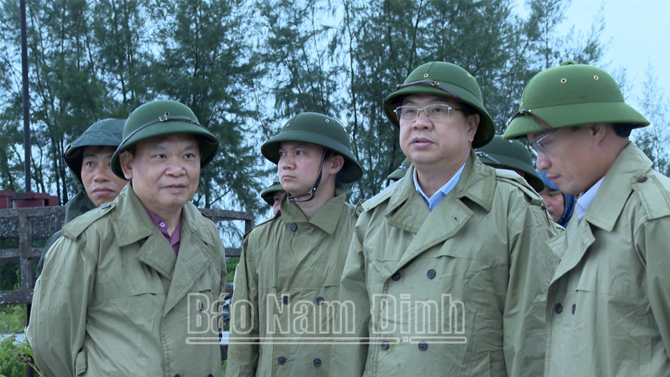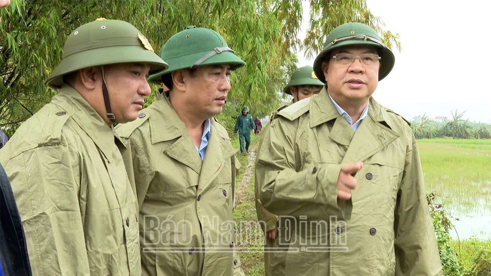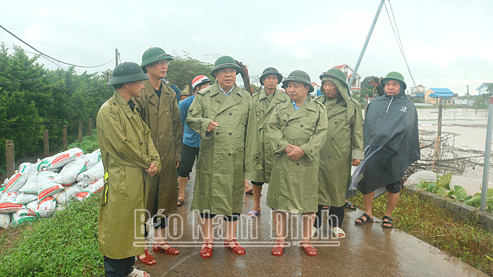 Tại huyện Trực Ninh, đồng chí Bí thư Tỉnh ủy đến kiểm tra khu vực bối Nội Xuyên, xã Phương Định, nơi mưa lớn làm nước sông Ninh Cơ dâng cao, có nguy cơ tràn qua bối, đe dọa trực tiếp đến an toàn của 459 hộ dân với 1.455 nhân khẩu. Hiện tại, huyện Trực Ninh đã gia cố các điểm bối có nguy cơ tràn bằng bao tải cát và di chuyển 400 hộ dân với 1.200 nhân khẩu đến nơi an toàn, những hộ còn lại đều sống trong nhà kiên cố. Đồng chí Bí thư Tỉnh ủy nhấn mạnh, cần tổ chức di dời 100% người dân ra khỏi khu vực nguy hiểm, kể cả những hộ có nhà kiên cố, sẵn sàng cưỡng chế di dời nếu cần thiết. Bên cạnh đó, phải chuẩn bị đầy đủ chỗ ở, lương thực, thực phẩm, thuốc men cho người dân tại nơi tránh trú.