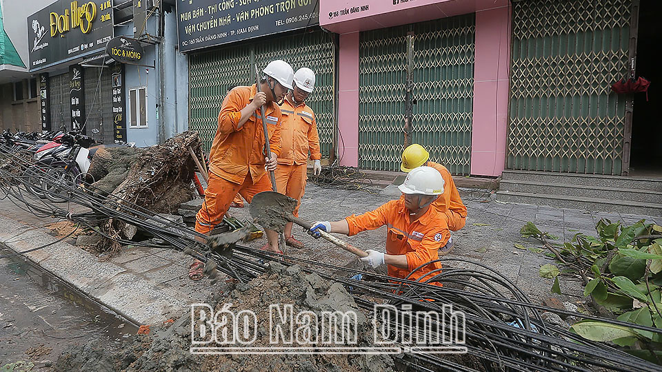 | Điện lực thành phố Nam Định khắc phục sự cố hệ thống điện bị ảnh hưởng sau bão. |