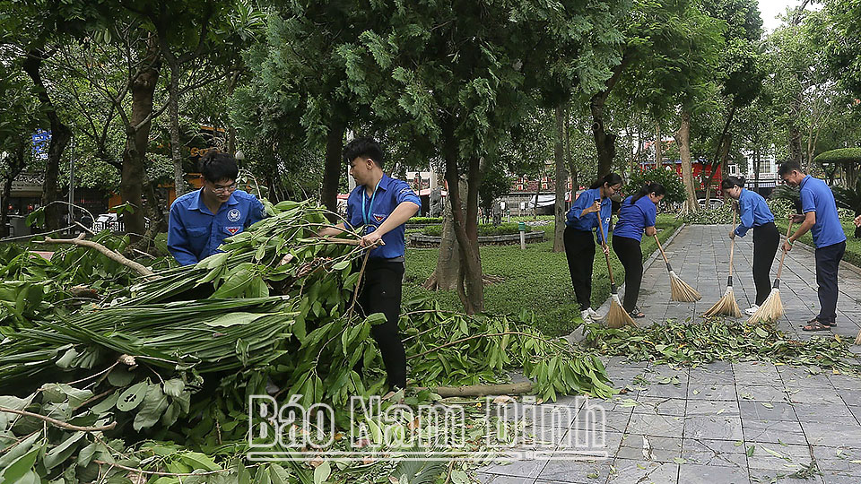 | Đoàn Thanh niên phường Trần Hưng Đạo, thành phố Nam Định tình nguyện thu dọn cây đổ sau bão. |