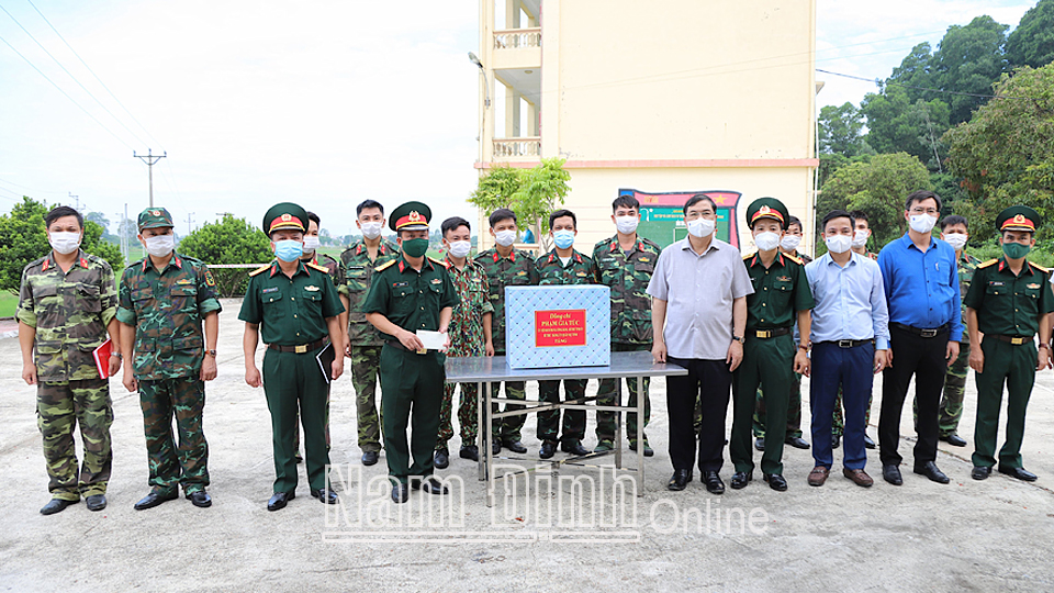 | Đồng chí Bí thư Tỉnh ủy tặng quà các lực lượng quản lý khu cách ly tập trung tại xã Nam Vân (Thành phố Nam Định). |